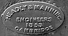 Seen on a 130 gal wheeled water barrel, with a hand pump mounted on the end, at a Steam Fair in Cheltenham, Glos. The handpump had no markings. A c.1900 catalogue of theirs advertises "liquid manure and water carts, sanitary tumbler carts, street watering carts and vans, street sweeping machines, builders and contractors carts, pumps and hoses". The company also made a range of chain pumps. | ||