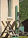 plank-mounted pump, complete with air vessel, in a tumbledown hut near the old