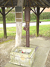 This flywheel and crank pump is on the green at Woodbastwick, Norfolk. You can just make out the twin-throw mechanism underneath the wooden boxing and there's also evidence of a probable second spout at higher level (not shown in the images). Photos supplied by Gareth Hughes - thanks, Gareth - who reports that the wooden beams of the shelter are inscribed: | ![]() |